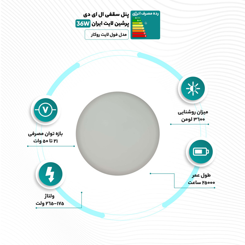 رده مصرف انرژی این پنل در سطح +A بوده، که نشاندهنده کارایی بالا و مصرف مناسب انرژی است. جنس بدنه این پنل سقفی از پلی کربنات باکیفیت بالا ساخته شده است که ضمن افزایش مقاومت و استحکام، به پایداری و طول عمر بالای پنل کمک میکند.