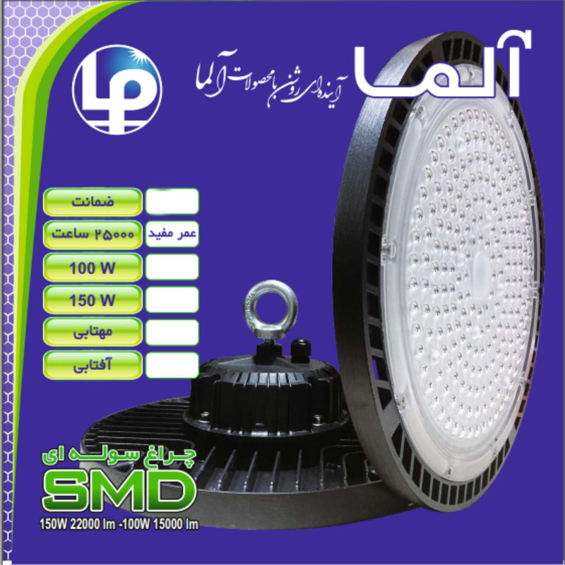 چراغ های سوله ای صنعتی و کارگاهی اس ام دی (smd) IP66 آلما با پخش یکنواخت نور و بدون تولید اشعه ماورا بنفش و UV می باشد. جایگزین مناسبی برای چراغ های سوله ای قدیمی بخار جیوه، متال هالید و فلورسنت است.شرکت ایرانی نورسازان آلما یکی از تولیدکنندگان پرآوازه و معتبر داخلی است که در زمینه ی تولید انواع گوناگون پروژکتور ال ای دی، SMD و COB، انواع جت لایت ها ، پنل های فول لایت ،مهتابی های ال ای دی ،چراغ های سوله ای و ...فعالیت می کند.و با بهره مندی از کادر مجرب و مهندسین توانمند و استفاده از پیشرفته ترین تکنولوژی های روز دنیا، مواد اولیه درجه یک و دستگاه های نوین صنعتی اقدام به تولید محصولات ذکر شده با بالاترین کیفیت کرده و بخش عظیمی از نیاز بازار روشنایی های داخلی را برطرف نموده است. یکی از پرکاربرد و پرفروش ترین محصولات شرکت نورسازان آلما که برای نورپردازی انبارها، کارخانهها، سولهها مورد استفاده قرار می گیرد، چراغ کارگاهی و سوله ای 150 وات می باشد که با استحکام و دوام بالا در برابر شرایط نامساعد جوّی و محیطی، درجه حفاظت IP66، عمر مفید طولانی و خروجی نور بالا برای روشنایی انبارها، کارخانهها، سولهها و استفاده در فضاهای باز به کار می رود. چراغ سوله ای صنعتی ذکر شده با تعبیه ماژول های ال ای دی نوع SMD با توان مصرفی 150 وات، استفاده از لنز به جهت افزایش راندمان و هدایت شار نوری ،بدنه آلومینیومی دایکاست به رنگ مشکی با تبادل گرمایی بالا ساخته شده است و به جهت محافظت در برابر نفوذ آب و گرد و غبار قسمت فوقانی بدنه این چراغ از رزین ساخته شده است و دارای طول عمر 25000 ساعت ، خروجی نور 19000لومن، بازدهی و راندمان بالا می باشد. این پروژکتور دارای درجه حفاظتی IP66 و استحکام و دوام بالا در برابر گرما، سرما، باد، بارش باران، نفوذ آب و گرد و غبار، ضربه و لرزش می باشد. ولتاژ ورودی 220 ولت برق شهری و فرکانس 50 هرتز، زاویه تابش نور 120درجه از سایر ویژگی های این پروژکتور می باشد.