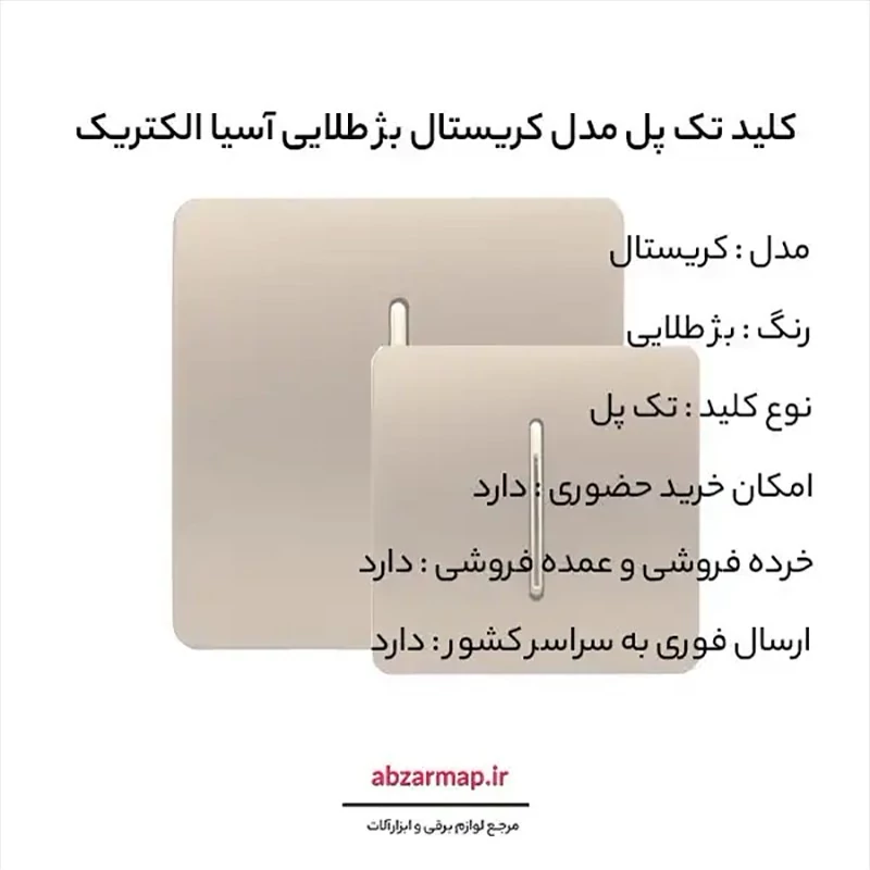 کلید تک پل مدل کریستال بژ طلایی آسیا الکتریک ✅ طراحی لوکس و منحصر به فرد ✅ کیفیت بسیار بالا ✅ رنگ بدنه بژ دکمه طلایی ✅ استاندارد ملی ایران ✅ عدم احتمال خطر برق گرفتگی ✅ 5 سال گارانتی معتبر شرکت آسیا الکتریک ✅ ارسال فوری به سراسر کشور خرید آسان و مطمئن رو با ابزارمپ تجربه کنید .