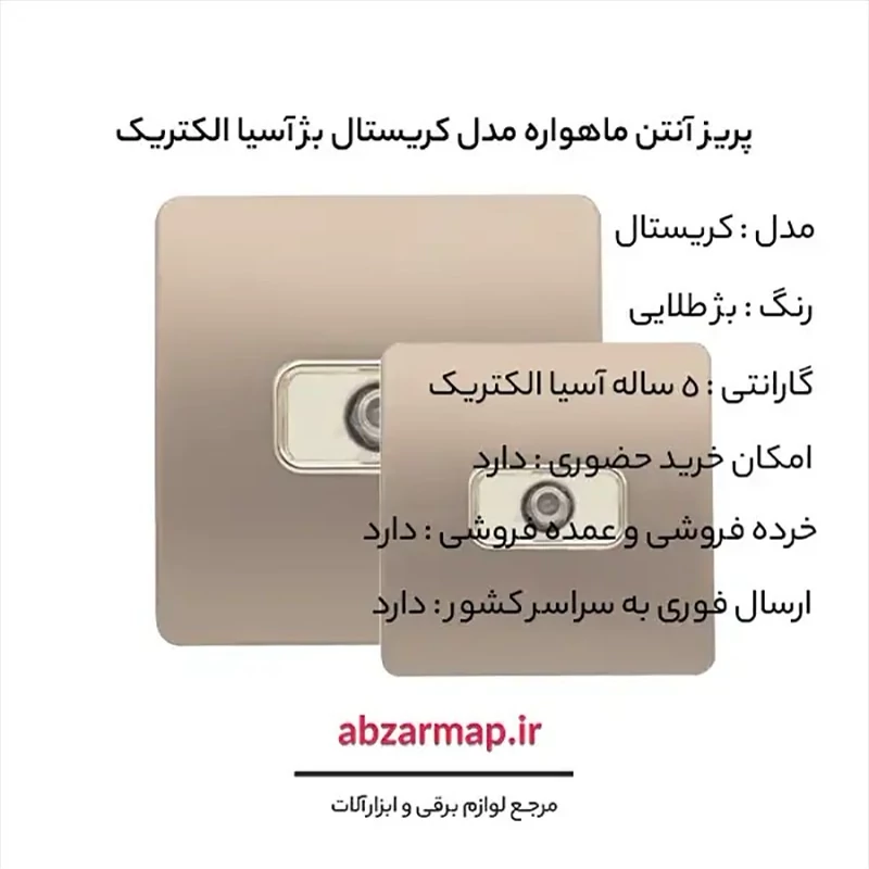 پریز آنتن مدل کریستال بژ طلایی آسیا الکتریک ✅ طراحی لوکس و منحصر به فرد ✅ کیفیت بسیار بالا ✅ رنگ بدنه بژ با دکمه طلایی ✅ استاندارد ملی ایران ✅ عدم احتمال خطر برق گرفتگی ✅ 5 سال گارانتی معتبر شرکت آسیا الکتریک ✅ ارسال فوری به سراسر کشور خرید آسان و مطمئن رو با ابزارمپ تجربه کنید .